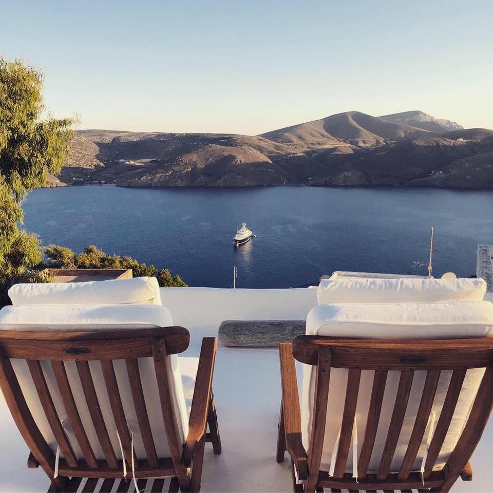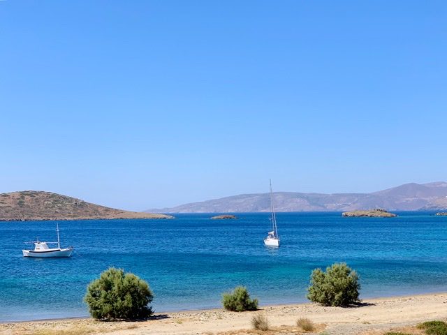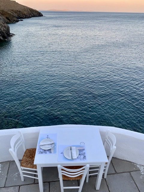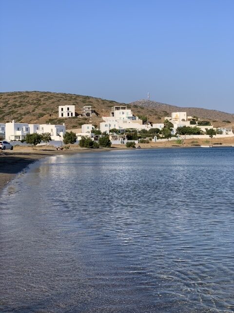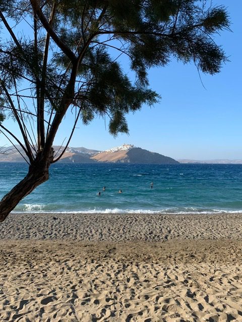 After landing at the tiny airport, we picked up our rental car and drove a mere 15 minutes to our Airbnb accommodation, a 3-bedroom small villa with a beautiful terrace, located directly on the beach of Maltezana, with a dreamy view to Chora.