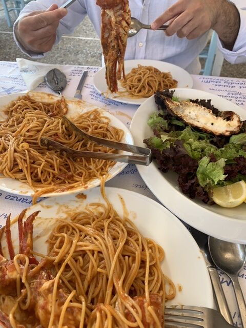 For lobster pasta, a local specialty, opt for a sea-side table at Almyra and Astakoukos in Maltezana.