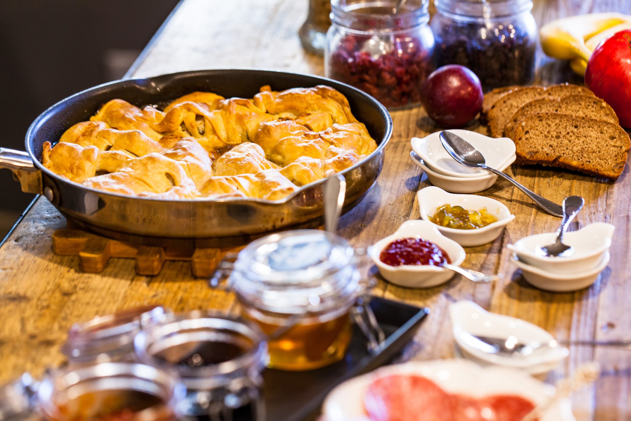 The breakfast, served on a long communal table in the main kitchen, is a delightful daily ritual, where mouth-watering recipes are served (eggs, home-made cakes and marmalades, pies, fruit juices, freshly brewed coffee…).