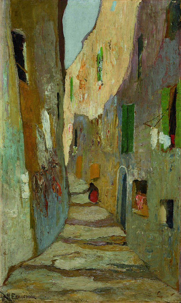 The first section of the exhibition refers to antiquity: starting with the iconic image of Pallas Athena, designed by Nikolaos Gyzis for the banner of the University of Athens, it features works that depict mythological figures, scenes from ancient history and views of archaeological landscapes, which prompted new quests in modern Greek art in terms of such concepts as measure, harmony, beauty.