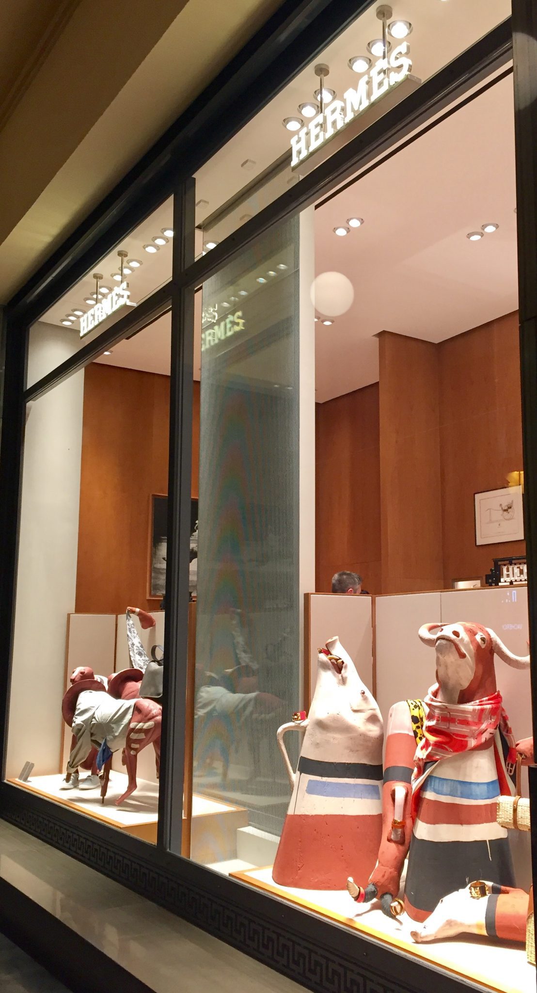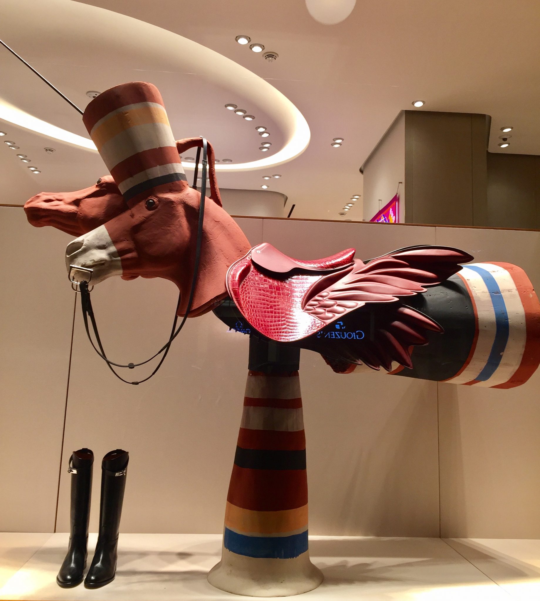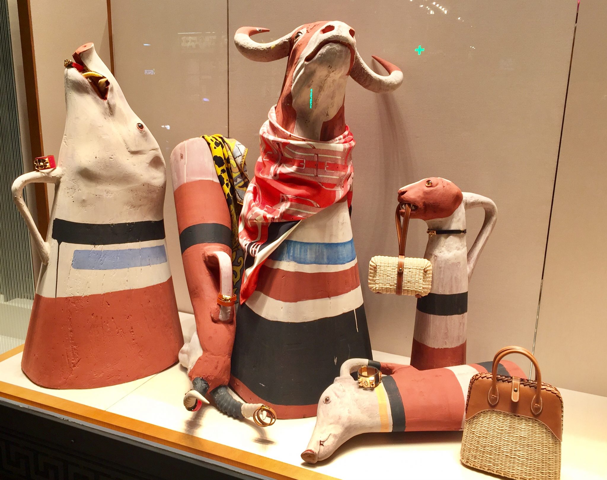 Three special windows, inspired by Hermès’ 2017 theme “Object sense” with displays designed by Greek artist Socratis Socratous, present an installation revisiting the recurrent theme of zoomorphism as found in Mediterranean cultures, combining it with Hermès imagery and philosophy. Constructed with diverse materials such as iron and bronze, the objects engage in an active dialogue with those by Hermès, and generate a stimulating and thought-provoking narrative between the imaginary and the real.