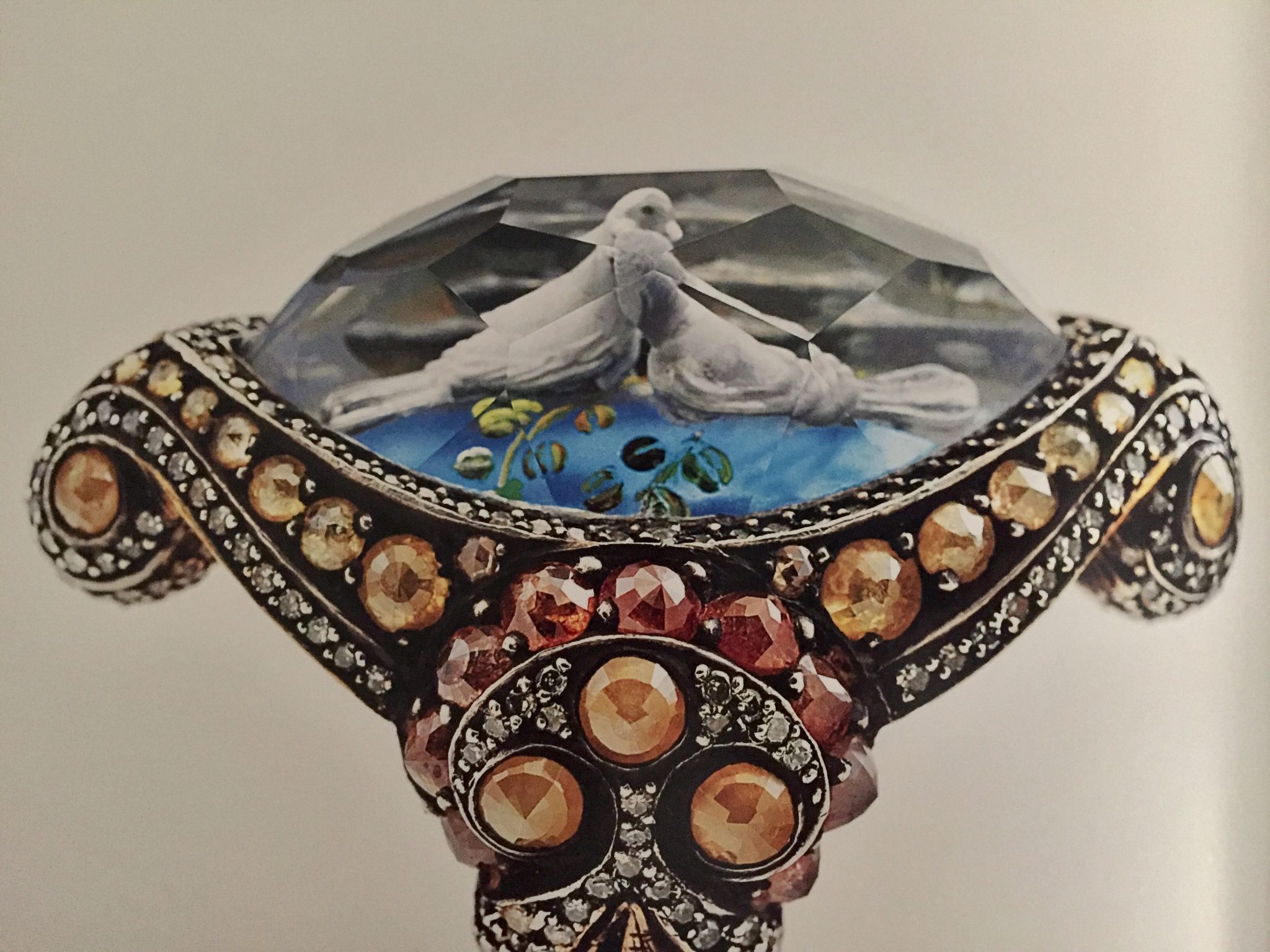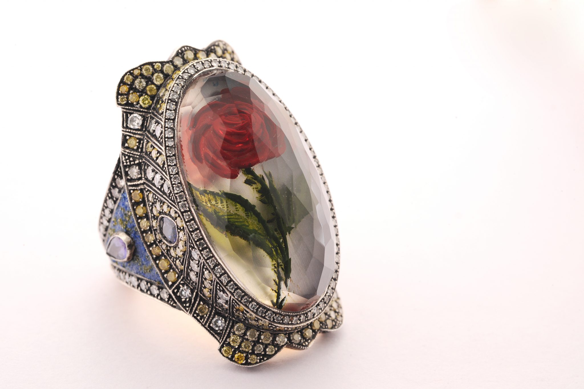 His success turned to a magnet for domestic talents. He works with goldsmiths, silversmiths, sculptors, painters, carvers, mosaic-setters and calligraphers, each contributing his craft to a piece of jewellery. They are willing to devote a considerable amount of time to each single piece and go to extreme levels of attention to detail. The aim is to take the craft skills and techniques to the next level, thus revealing even more elaborate stories. Reverse intaglio carving is just one of the complex techniques, and very typically, it asks for a remarkable amount of working hours and gemstones, as many executions end up not qualifying for eventual use. If time is money, in Sevan Bıçakçı’s case, it can only be the other way around: The longer the time, the better the value…