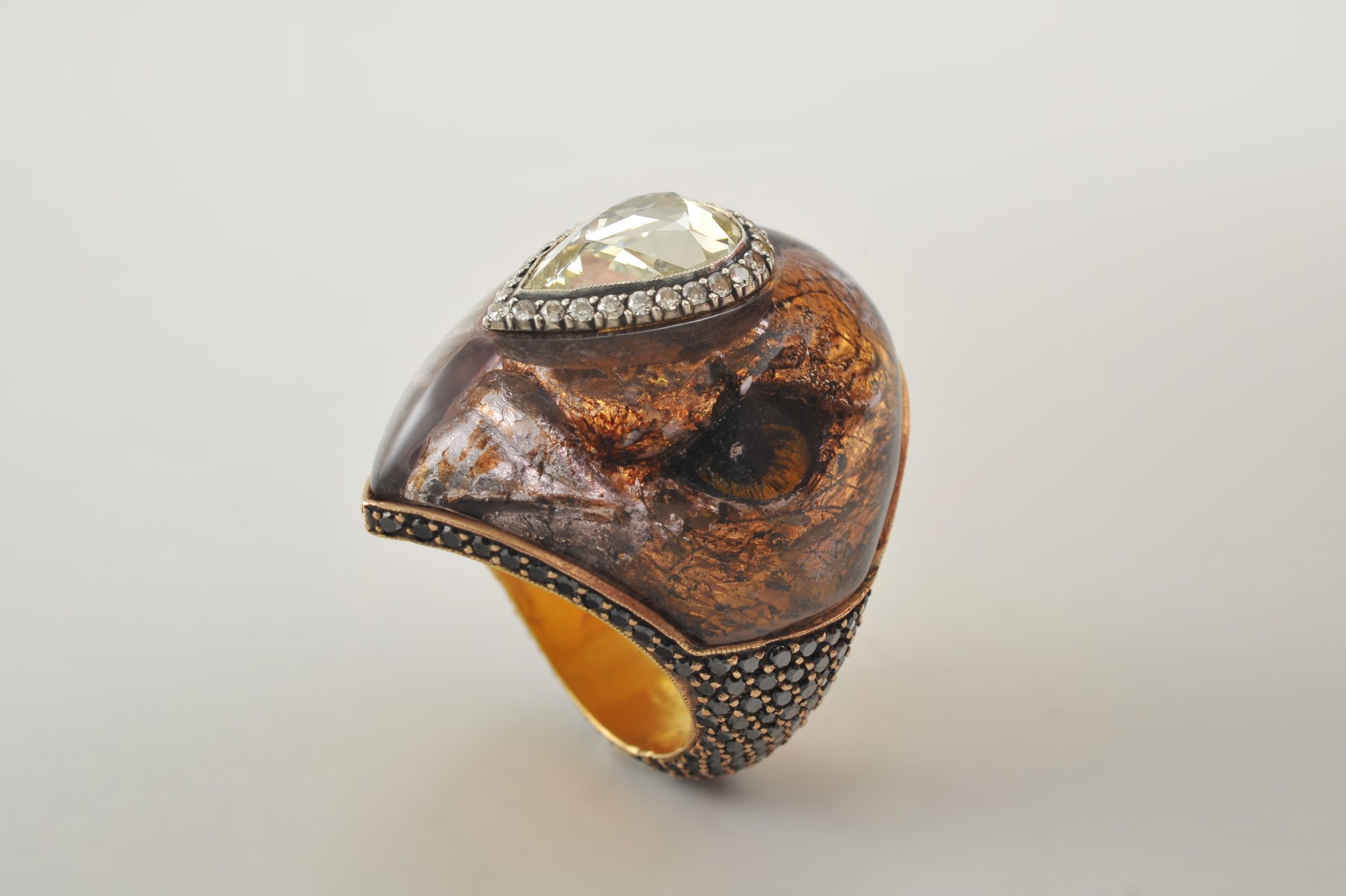 An admirer of Carl Fabergé and René Lalique, he does not like to use 14 and 18K gold and modern (brilliant) cut diamonds. He likes his work to look ancient, yet ageless, and uses a long list of genuine things from bones to rough diamonds.