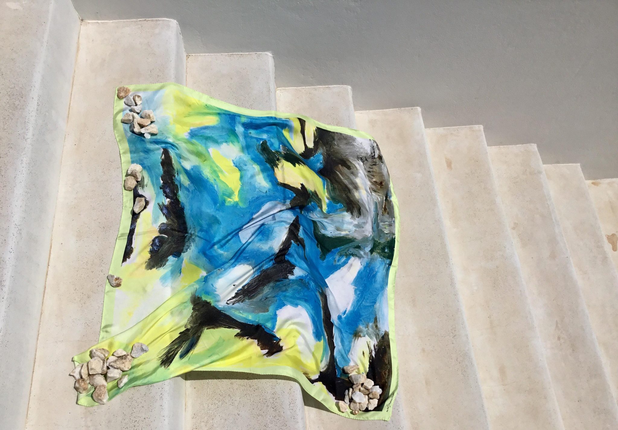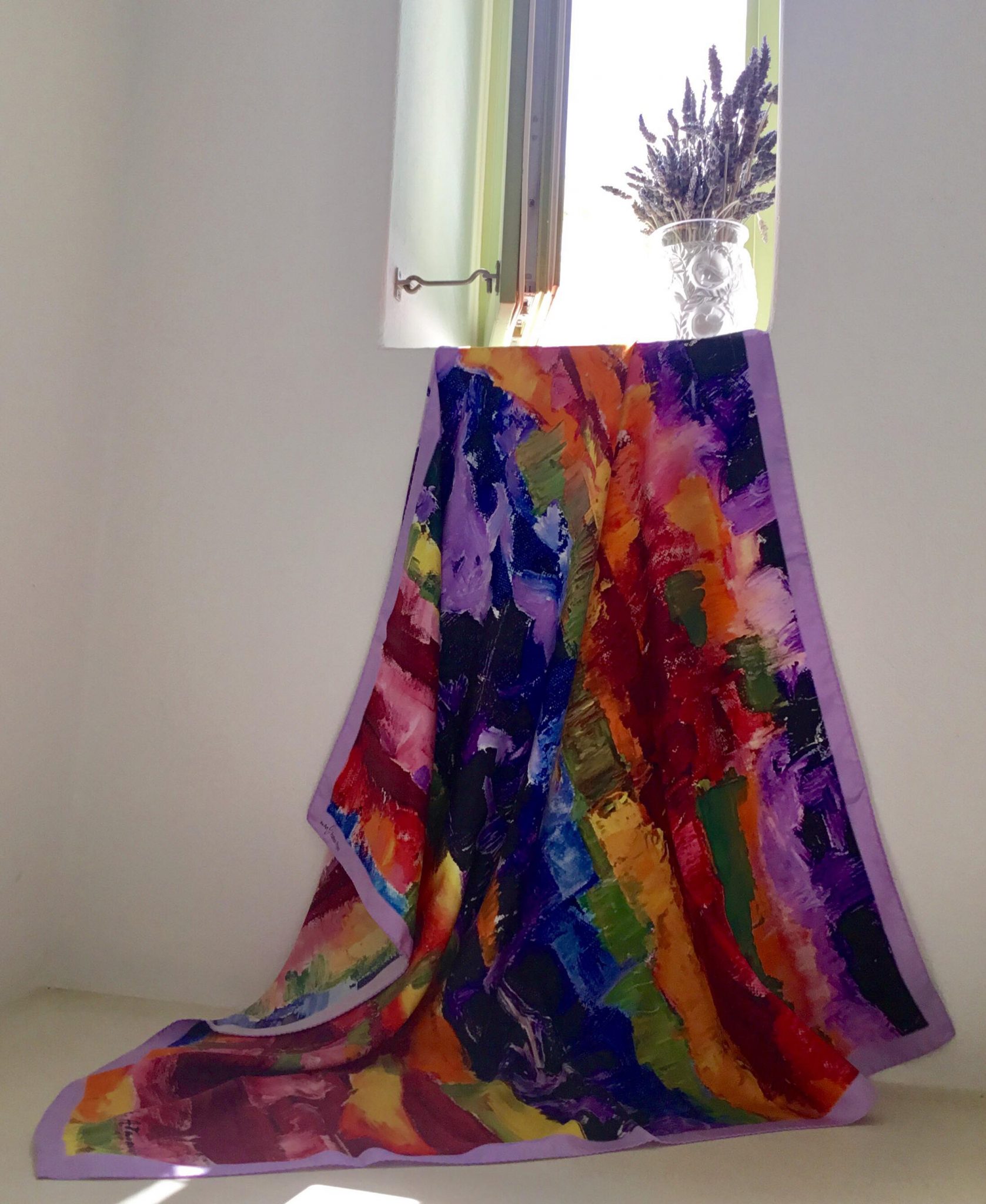 The idea was born out of the artwork itself. The vidid colors and their combinations, the image that creates euphoria and sentiments of joy! That’s how the search began. And the pieces of the puzzle came together with a silk-processing artisan in Soufli, who preserves the tradition of the past and uses the latest digital printing technology requirements.