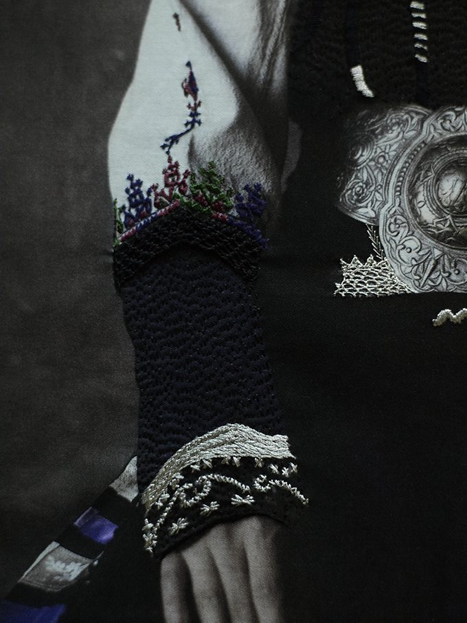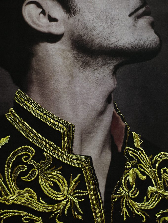 Printed on canvas, his images were gifted with the depth and complex readings of a painting. Very soon after, without plan or discussion, Anatoli Georgiev, the photographer’s friend and collaborator for the past five years, reached for the canvas and unconsciously began to embellish its details and fragments, offering Vangeli’s portraits a vibrant, third dimension, unlocking new, multiple readings of the same image, this time through texture and volume.