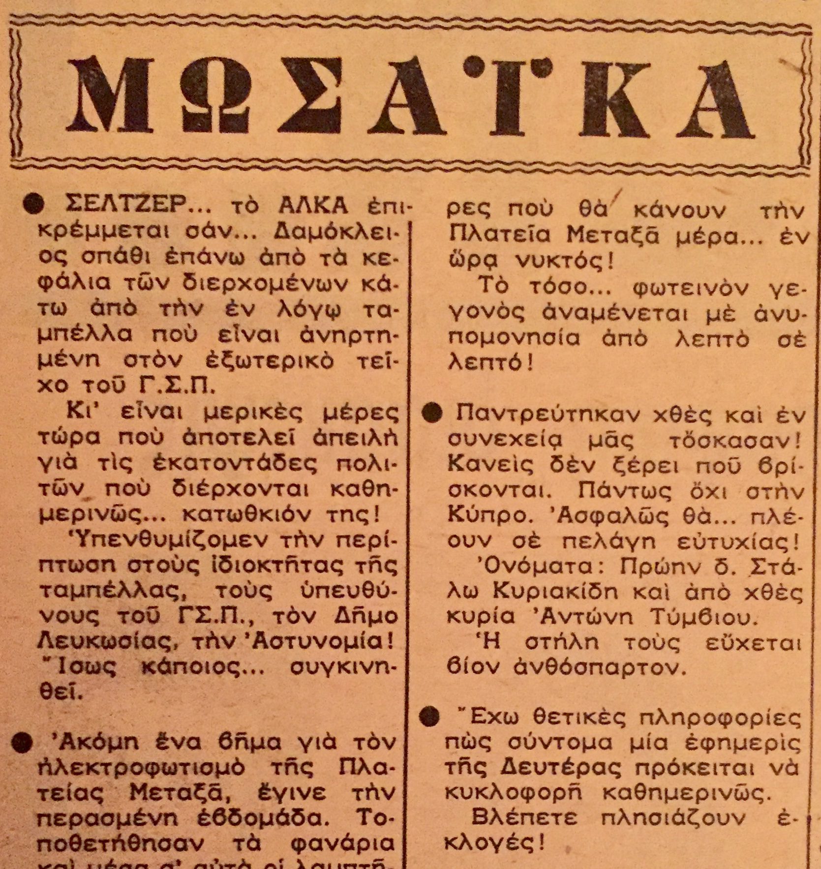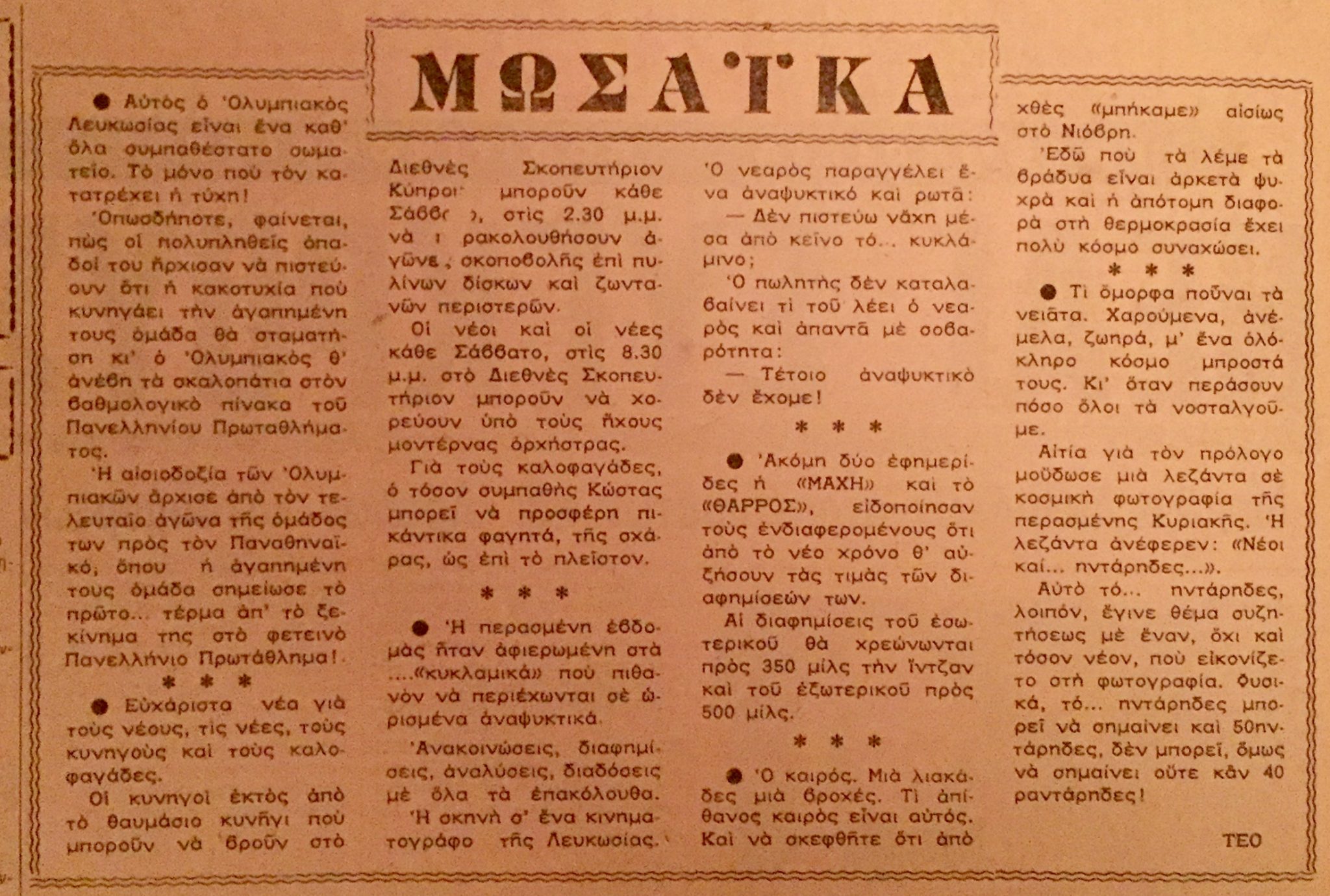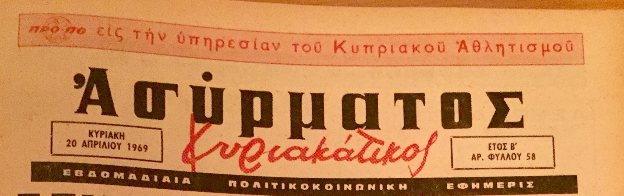 This was the name my father called his weekly social column, published in the Sunday edition of the newspaper “Asyrmatos”, owned by my dear uncle Dinos. That was of course back in the 60’s, a golden era for Cyprus, an era that abruptly ended in July of 1974.