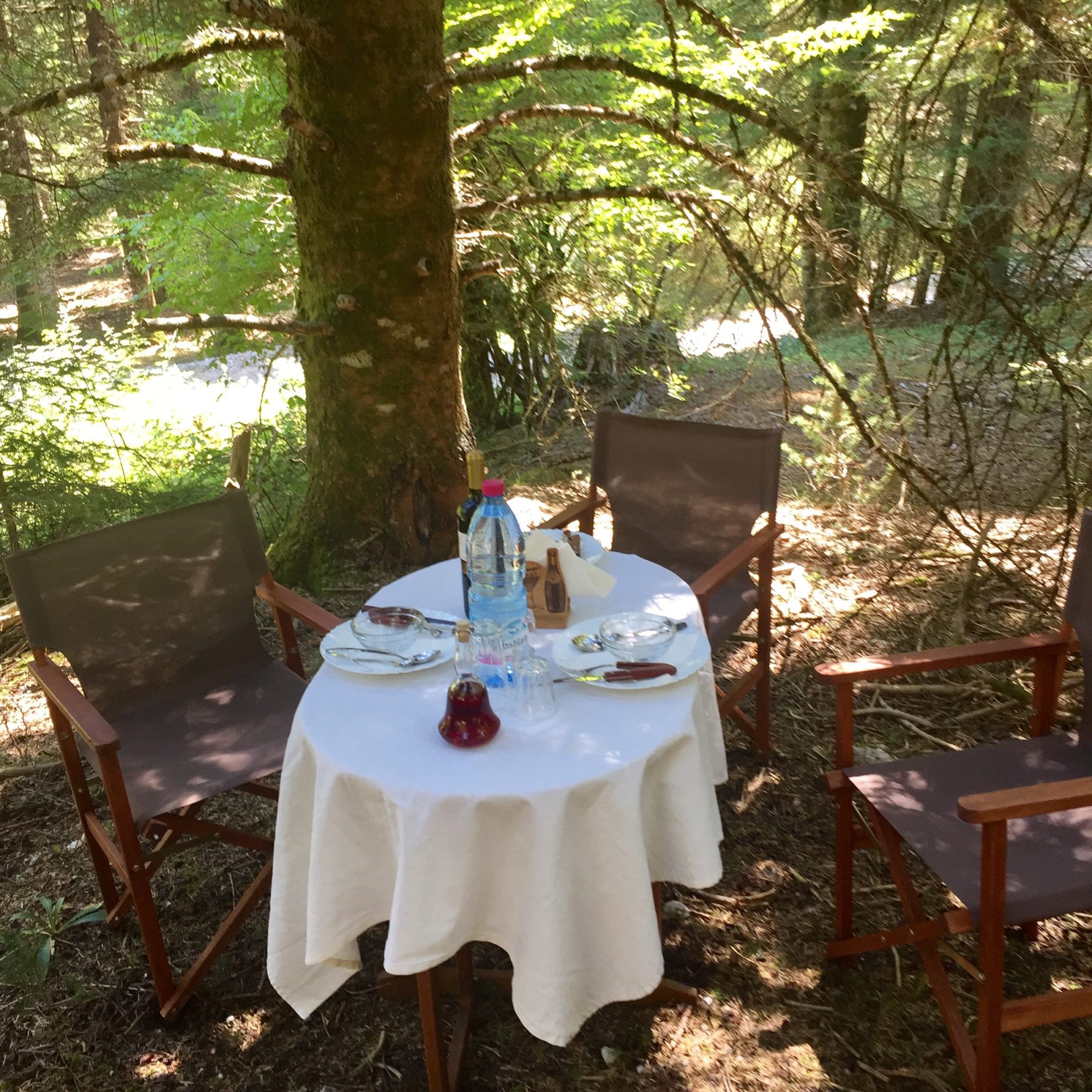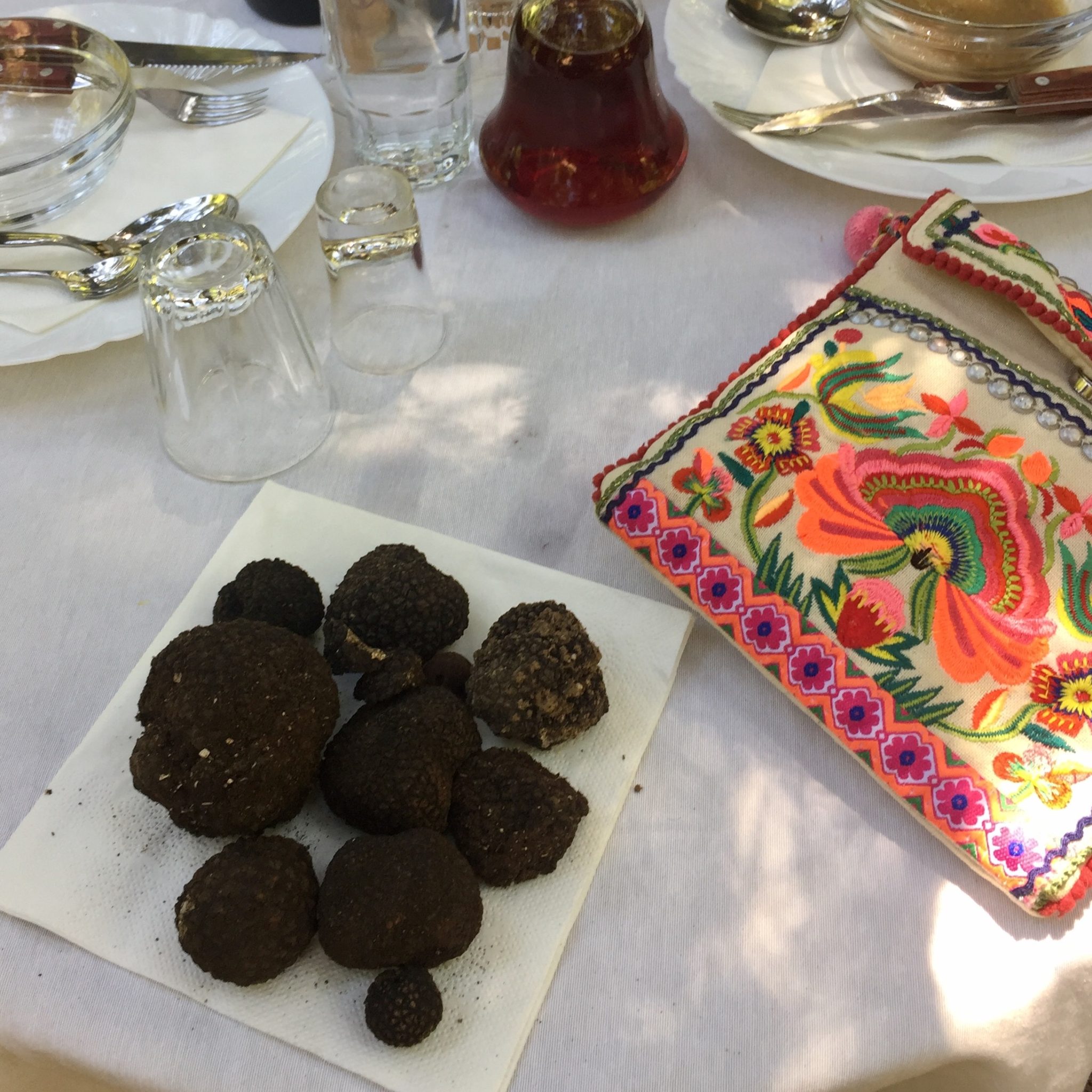 One of the highlights of our holidays was the truffle hunting experience at Mitsikeli, that dear Athina helped us organise with Katerina and Christos of Aroma Troufas. Yes! You can hunt for truffles in Greece! On an otherwise very hot day, we were lucky enough to walk in the woods with the cutest dogs, that would sniff the mushrooms and indicate their position. After a couple of hours of this pleasant wandering around and an impressive crop (see photos!), Katerina escorted us to an opening where Christos had prepared a table complete with a table cloth, napkins, red wine, local liqueur and all! We then enjoyed a tasty mushroom soup, an omelette and oven potatoes with truffles and a delicious desert. An unforgettable experience!